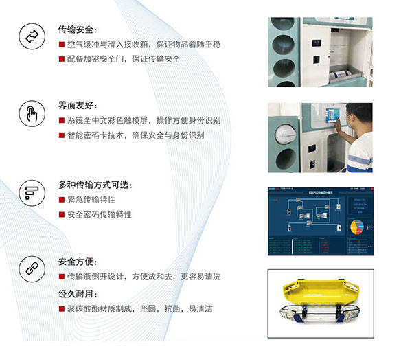 以传输瓶为载体,空气压缩机为动力,在密封的管道中,高速传递院内常见小型医疗物品的自动化设备。